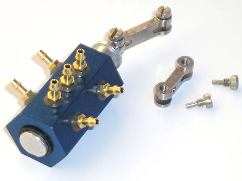 JMP’s 2-way Hex Valve is now available. This servo controlled valve features six output fittings which will directly operate a common three air cylinder retract system. The Hex Valve will often eliminate most or all of the T-fittings. The spool design has definite end stops which eliminates over travel. This is the highest flow retract cylinder operating valve available and can be ordered with hose barbs for 1/16” i.d. air line or 4mm air line.