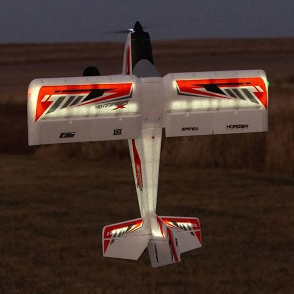 The E-flite® Timber® X 1.2m combined the STOL capabilities of the original Timber 1.5m model with a wing design featuring oversized ailerons and flaps, plus an enlarged rudder and elevator and a more powerful 3S and 4S compatible power system, to also deliver 3D performance you’d expect from an all-out aerobat. Now the Night Timber® X 1.2m adds factory-installed, high-visibility LED lights throughout the airframe for flying all day AND all night! It’s also equipped with a 60-amp Spektrum™ Avian™ Smart ESC, and the BNF® Basic version is equipped with an AR637TA receiver that offers full-range telemetry including real-time battery voltage, current, temperature and more – along with motor reversing for special ground handling and other capabilities – when using compatible transmitters.