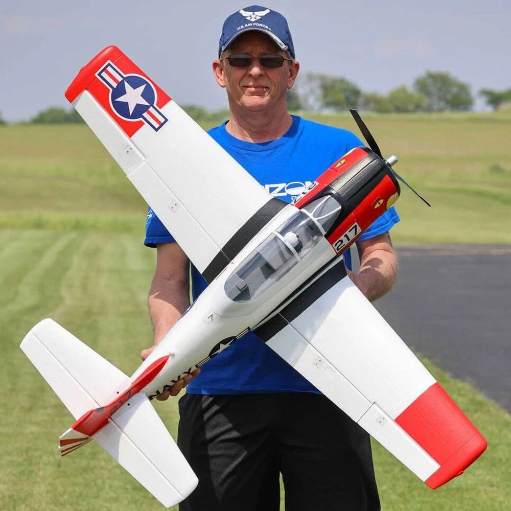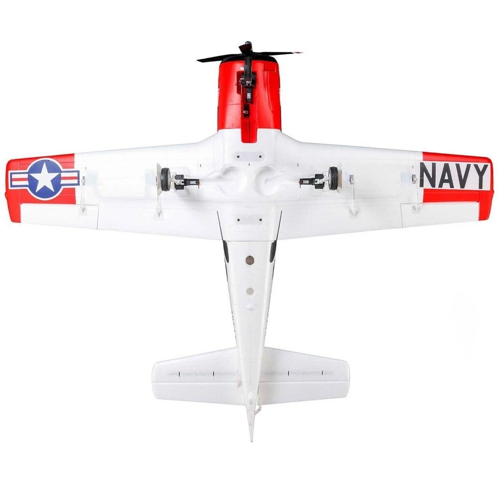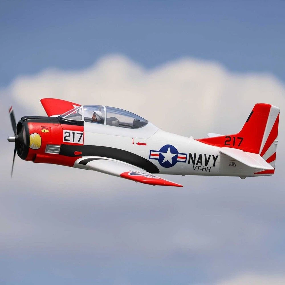 This E-flite® T-28 Trojan 1.2m has been updated and upgraded to be the Smartest, most powerful, and easiest to fly scale model of the popular warbird yet! Like the original version, it includes functional flaps and retracts that make it a true “full-house” warbird model. Its factory-installed brushless power system features a specially-tuned motor, 3-blade prop, and 70-amp Spektrumâ„¢ Avianâ„¢ Smart Lite ESC that combine to deliver an abundance of thrust with a 3S LiPo battery, or more speed and nearly unlimited vertical performance with a 4S battery — without any modifications or upgrades. With a compatible receiver (such as the AR631 included with the BNF® Basic version) and Smart or non-Smart batteries, the Smart Lite ESC can deliver a variety of real-time power system telemetry data including motor RPM, current, battery voltage, and more to Spektrum AirWareâ„¢ equipped transmitters. The AR631 receiver installed the BNF Basic version also includes exclusive AS3X® and SAFE® Select technologies, which help to make this a perfect “next step” or first warbird model for anyone ready to move up after successfully learning to fly their first or second RC airplane. The durable airframe has an abundance of scale detail including panel lines, an instrument panel, and a pilot figure, plus it comes factory-finished in the iconic red and white trim scheme with updated nose art and markings. It can be flown by experienced pilots in spaces as small as a large park or soccer field, and by intermediate pilots at more traditional RC and other large fields. The 1.2m size allows for easy storage and transport without disassembly, or the one-piece wing can be removed and reinstalled easily for even greater convenience. Best of all, no glue is required for final assembly so you can have the T-28 Trojan 1.2m ready to fly in less time than it takes to charge a battery!
