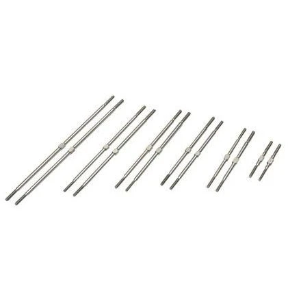 Each Pro-Link is machined from titanium bar stock and features a 4-40 right-hand thread on one side and a 4-40 left-hand thread on the other (turnbuckle). A machined hex in the middle allows you to make very fine length adjustments without removing the linkage from the servo arm or control horn. And because they are made of titanium, a 4-inch linkage weighs just 6 grams but has the strength to lift over 500 pounds.