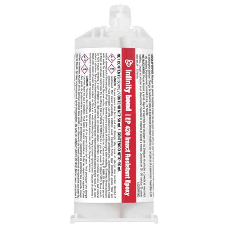 Infinity Bond EP 420 Black is a toughened epoxy adhesive giving it maximum impact, shock and vibration resistance. This 2:1 ratio epoxy has a slow set time giving users plenty of time to adjust and set parts and cures creating a super high strength bond. All cartridges come with two static mixers for efficient dispensing. The high strength bond created when using Infinity Bond EP 420 Black also offers great flexibility and temperature resistance on both the high and low ends.