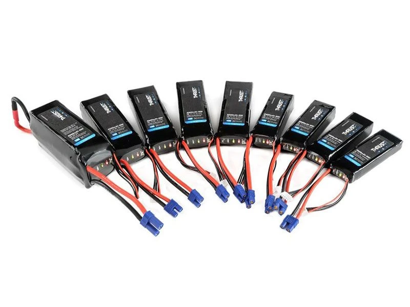 The E-flite Thrust VSI (Voltage Status Indicator) Lithium Polymer batteries feature an integrated voltage checker so that you can check the status of your battery on the go. A series of LED lights will indicate the state of charge and remaining capacity by the press of a button. Compact E-flite Thrust Series lithium polymer batteries are rated at 40C to offer an excellent power-punch without a major weight penalty. These batteries come with the popular EC3 (6S battery includes EC5 connector) for a level of durability that can be appreciated at all performance levels. Like the popular line of E-flite High-Power Li-Po batteries, its JST-XH balance connector is compatible with a wide range of popular chargers such as those from Orion and Dynamite. Available in a variety of sizes, capacities and voltages for use with park flyers up to large airplanes and helis, these batteries are Plug and play with E-flite ESC’s and chargers right out of the package.