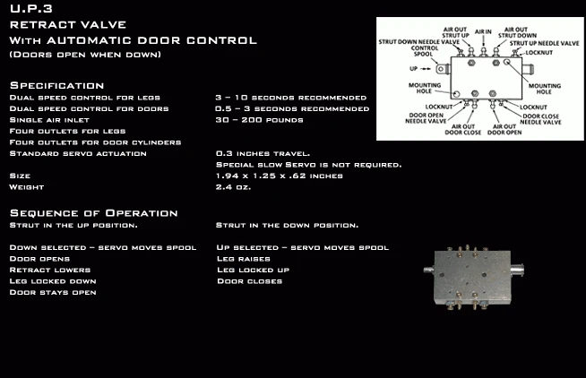 Retract Valve with Auto Door Control. Doors Remain Open when Gear is Down. Made for air up & air down driven retracts and air cylinder actuated gear doors. Single air inlet (30 to 200 psi). Two up & two down nipples for the retracts. Two open & two close nipples for the doors.
