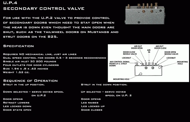 For use with the Ultra Precision UP2 valve to provide control of secondary doors which need to stay open when gear are down even though the main doors are shut, such as the F-15, P-51 Mustang ect…